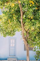 Een blauw huis in Griekenland met een citroenboom ervoor