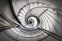 Bij mijn trip naar Hamburg, kon ik het niet laten ook weer wat trappen te bezoeken en vast te leggen. Het liefste fotografeer ik dan moderne trappen, waarvan deze er eentje is. Een industrieel vormgegeven trap met stoer staal gebruikt voor de trapleuningen en witte traptreden. Prachtig vond ik het zicht naar beneden dat je als het ware aankijkt als een groot blauw oog.