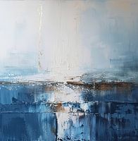 Blauw | Serene Blue Depths - Dit abstracte schilderij is gedomineerd door rustige blauwe en witte tonen, met gelaagde, texturale verftechnieken die een kalme, reflecterende wateroppervlak suggereren.