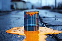 Maak een statement met dit Minimalistisch kunstwerk. Een blauw vat in een plas oranje verf. Perfect voor in de woonkamer of keuken.
