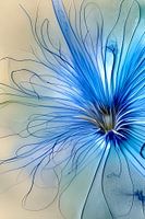 Zachte blauwe kleurtonen, vloeiende fijne lijnen, patronen, delicate fragiele elementen. Samengesmolten tot een sferisch mystiek organisch beeld.