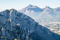 Blauw berglandschap en wandelavontuur in de Spaanse provincie Alicante. Deze foto is genomen op de top genaamd Orenga, die heel dicht bij de imposante bergketen van de Sierra de Bernia ligt. Deze top behoort niet tot de bekende wandelbestemmingen in de regio, maar is een geheime tip verwijderd van de gemarkeerde wandelpaden. Het is zeker de moeite waard om hoog te wandelen, want hier heerst een betoverende rust en kun je genieten van prachtige uitzichten op de omliggende bergen. Als je in de verte kijkt, rijzen de bergen genaamd Morro de l'Aspre en Puig Campana majestueus op in het weidse berglandschap. De rotsformaties liggen niet ver van de Middellandse Zeekust.