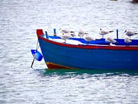 Koop de foto Blauw bootje met meeuwen in zee bij Bari van Judith van Wijk op canvas, aluminium dibond, (ingelijste) fotoprint, behang en ArtFrame, op maat geprint in Fine-Art kwaliteit.