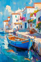 Een pittoresk dorpje troont op het glinsterende water, waar een felblauwe bootromp zachtjes aan de rand van de oever schommelt. De charmante witte huizen hebben kleurrijke bloemen en stralende gevels, terwijl de lucht oplicht in zachte blauwtinten. Een sfeer van rust en mediterrane levensvreugde omhult deze idyllische plek.