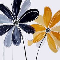 Twee grote, gestileerde bloemen met uitgesproken, contrasterende kleuren tegen een heldere, witte achtergrond. De bloemen, één in diepblauw en de andere in levendig oranje, zijn met brede en vloeiende penseelstreken neergezet. De eenvoud van het ontwerp en de duidelijke scheiding van kleuren geven het werk een moderne en grafische uitstraling. De centra van de bloemen zijn gedetailleerd met stippen, wat een gevoel van textuur en diepte toevoegt aan de anderszins platte bloembladen. Dit werk zou een gevoel van vreugde en levendigheid kunnen uitstralen in elke ruimte waar het wordt tentoongesteld.