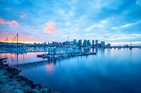 Een serene zonsopgang boven de skyline van een stad, weerspiegeld in het gladde water van een haven vol bootjes. Een pier waar verschillende kleine boten liggen aangemeerd, tegen een achtergrond van tinten die opgaan in de wolken erboven.