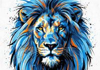 Digitaal schilderij van een leeuw's gezicht, met de nadruk op levendige blauwe en oranje tinten. Witte achtergrond met spateffect.