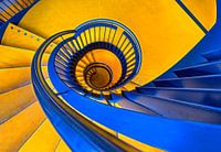 Wenteltrap in geel en blauw met een fraaie lijnwerking.