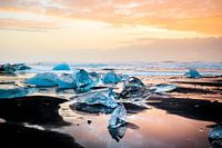 De foto toont de ruige schoonheid van IJsland in de winter. Het ongepolijste, blauw glinsterende ijs op het strand doet denken aan fonkelende diamanten die aanspoelen uit de Noord-Atlantische Oceaan. Het ochtendlicht baadt het landschap in een magische dageraad en de lucht gloeit diep oranje, alsof de wereld in vuur en vlam staat van de opkomende zon.