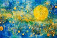 Een abstract schilderij in blauw en goud met een stralende maan en kosmische accenten straalt een dromerige en poëtische sfeer uit. Een tijdloos abstract werk, geïnspireerd door Vincent van Gogh, dat herinnering en verwondering oproept.
