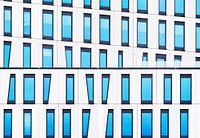 Dit modern gebouw in Amsterdam had een verspringende gevel. De ramenrij weerspiegelt de blauwe lucht. Door de herhalingen vond ik dit een interessant grafisch beeld worden.