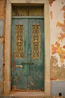 Wat verbergt deze antieke houten blauw groene deur met traliewerk en geel oranje bladderende muren in Portugal? Wonen er meerdere mensen achter de deur? Of vertegenwoordigt elk van de sleutelgaten een nieuwe bewoner?