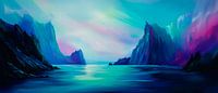 Het zachte samenspel van blauwgroene tinten en mystieke bergsilhouetten voert je mee naar een droomlandschap. De harmonieuze kleurlagen roepen een gevoel van rust en ruimte op. Dit kunstwerk is perfect voor de slaapkamer of woonkamer om een ontspannen sfeer te creëren en het oog altijd te inspireren om te dromen.