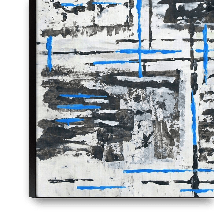 Een patroon van boven elkaar geplaatste fijne blauwe rasterdraden loopt over een basisraamwerk van zwarte en witte vierkanten.