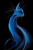 Een elegant, door de wind geteisterd wezen ontvouwt zich in glinsterende blauwtinten. De gebogen lijnen vormen het majestueuze profiel van een kat wiens bewegingen zowel sierlijk als mysterieus zijn. De fijnste haarlokjes geven de afbeelding levendigheid, terwijl de donkere achtergrond de betoverende aanwezigheid van dit gestileerde schepsel versterkt.