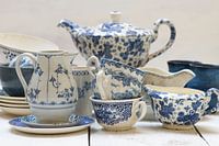 Oud blauw servies, kannen, kopjes, schotels, theepot en juskom