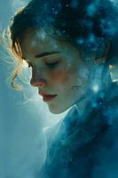 Het kleurenpalet beweegt zich in een prachtig spectrum van turquoise en blauwe tinten, variërend van diep middernachtblauw tot lichte aquamarijne nuances. Deze koele kleuren worden onderbroken door warme gouden lichtreflecties op de huid, waardoor een perfecte balans ontstaat tussen kou en warmte. De glinsterende deeltjes die het hele beeld doordringen doen denken aan sterrenstof of kosmische nevels.