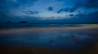 Na zonsondergang is er altijd een moment van blauw licht. Ik zette m'n statief op en wachtte af. De vloed kwam op zetten. Het weer terugtrekkende water liet een natte laag achter, waarin het blauwe licht prachtige reflexteerde. Genomen aan de westkust van Ko Chang, Thailand