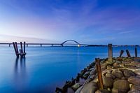 Het is een koele, winderige avond op het blauwe uur in januari op de Fehmarnsund.