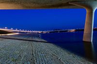 Het blauwe uurtje - net na zonsondergang - aan de Spiegelwaal, tussen Nijmegen en Lent. Onder de nieuwe brug De Lentloper, ontworpen door architect Laurent Ney.
