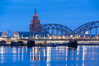 Blauw uur in Riga: Academie van Wetenschappen, Centrale Markt, spoorbrug over de Daugava