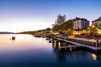 Restaurants en cafés aan de promenade langs het meer van Überlingen bij avond, Baden-Württemberg, Duitsland.