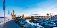 De haven van Lindau met de vuurtoren, de Beierse Leeuw en de Mangturm in de avond, Beieren, Duitsland.