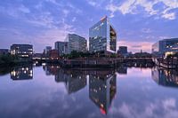 Deze fascinerende foto, genomen op de Ericusspitze in Hamburg, legt de overgang van dag naar nacht vast in een adembenemende lange belichting. De lucht vertoont nog steeds de laatste roodachtige tinten van de avond, terwijl de lichten in de ramen van de torenflats al beginnen te gloeien. De zijdeachtige reflectie van de verlichte gebouwen in het kalme water van de Ericusgraben is bijzonder indrukwekkend en voegt een extra dimensie van diepte en harmonie toe aan het beeld. De zachte, zachte overgangen van de kleuren in de lucht vermengen zich met de gereflecteerde lichten en creëren een bijna surrealistische scène. Deze perfecte balans tussen de natuurlijke schoonheid van de lucht en de stedelijke structuren van de stad maakt deze foto tot een uitstekend kunstwerk. Het is ideaal om een vleugje elegantie en stedelijke romantiek toe te voegen aan moderne woon- of werkruimtes en om het bruisende leven van Hamburg stijlvol te laten zien.