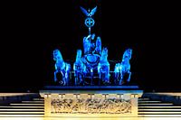De verlichte Quadriga aan de Brandenburger Tor, ter gelegenheid van een lichtfeest in de Duitse hoofdstad Berlijn.