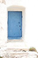 Oude deur (Grieks blauw) in witte verweerde gevel. Huisje / cottage in Mediterrane sfeer. Vakantie, zomergevoel, vakantiegevoel, mooie herinneringen en vakantieherinneringen aan Griekenland. Degeneratie, verval, verwaarloosd.