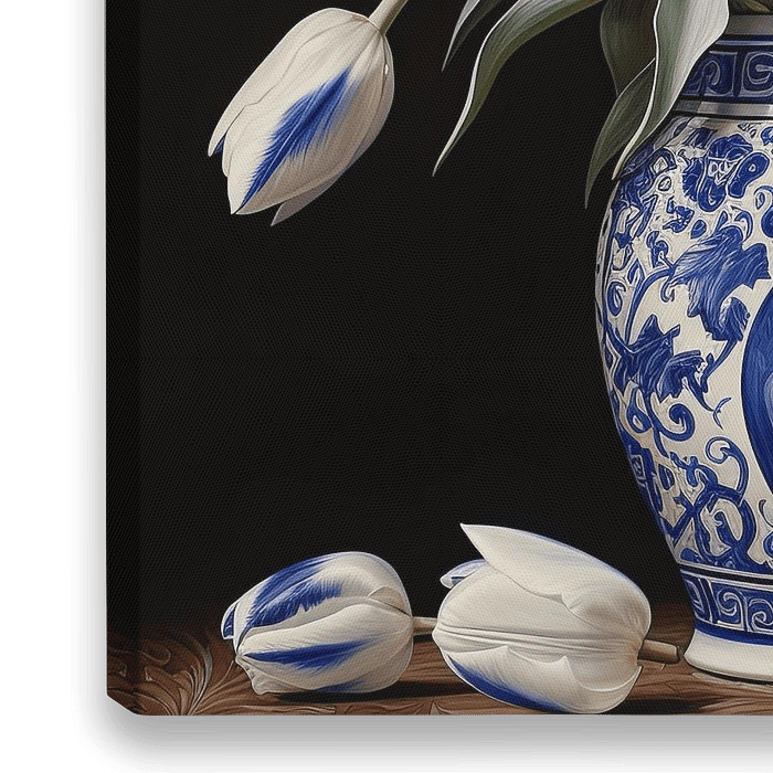 Koop dit bloemen kunstwerk Blauw wit tulpen stilleven in Delfts blauwe vaas van Vlindertuin-Art op canvas, aluminium dibond, (ingelijste) fotoprint, behang en ArtFrame, op maat geprint in Fine-Art kwaliteit.