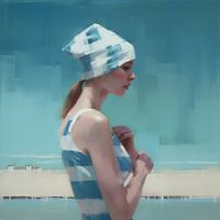 De blauwe en witte kleuren zijn dominant en geven een fris, kalmerend gevoel dat wordt geassocieerd met de zee of een heldere lucht. De figuur lijkt in gedachten verzonken, en de keuze om haar van de zijkant te portretteren versterkt het gevoel van introspectie en stilte.