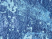 Een close-up van een oude laag blauwe verf die van een muur afbladdert, levert interessante patronen op.