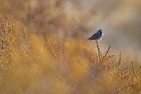 Blauwborst (zangvogel) zingend in ochtendlicht in duindoorns. Kleurrijk oranje knopjes en blauwe borst.