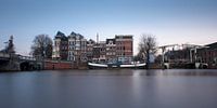 Links de Blauwbrug over de Amstel, rechts een ophaalbrug en ertussen typisch Amsterdamse huizen.