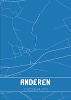 Blauwdruk van de landkaart / plattegrond van de Nederlandse plaats Anderen, gelegen in gemeente Aa en Hunze, provincie Drenthe. De kaart bevat alle openbare wegen en de coördinaten van het centrum van Anderen.