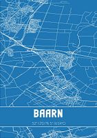 Blauwdruk van de landkaart / plattegrond van de Nederlandse plaats Baarn, gelegen in het Gooi, in gemeente Baarn, provincie Utrecht. De kaart bevat alle openbare wegen en de coördinaten van het centrum van Baarn.