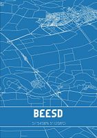 Blauwdruk van de landkaart / plattegrond van de Nederlandse plaats Beesd, gelegen in de Betuwe, in gemeente West Betuwe, provincie Gelderland. De kaart bevat alle openbare wegen en de coördinaten van het centrum van Beesd.