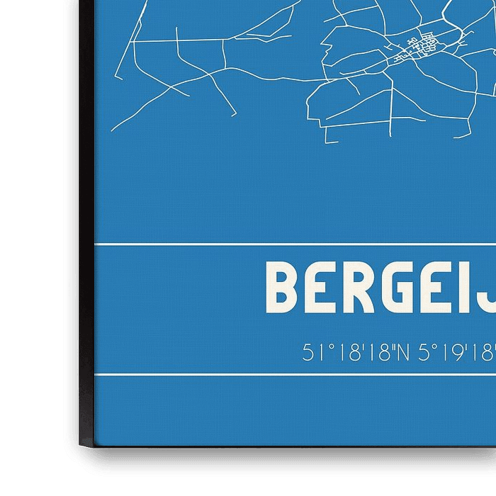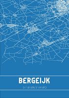 Blauwdruk van de landkaart / plattegrond van de Nederlandse plaats Bergeijk, gelegen in gemeente Bergeijk, provincie Noord-Brabant. De kaart bevat alle openbare wegen en de coördinaten van het centrum van Bergeijk.