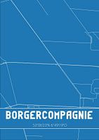 Blauwdruk van de landkaart / plattegrond van de Nederlandse plaats Borgercompagnie, gelegen in gemeente Veendam, provincie Groningen. De kaart bevat alle openbare wegen en de coördinaten van het centrum van Borgercompagnie.