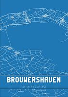 Blauwdruk van de landkaart / plattegrond van de Nederlandse plaats Brouwershaven, gelegen in gemeente Schouwen-Duiveland, provincie Zeeland. De kaart bevat alle openbare wegen en de coördinaten van het centrum van Brouwershaven.