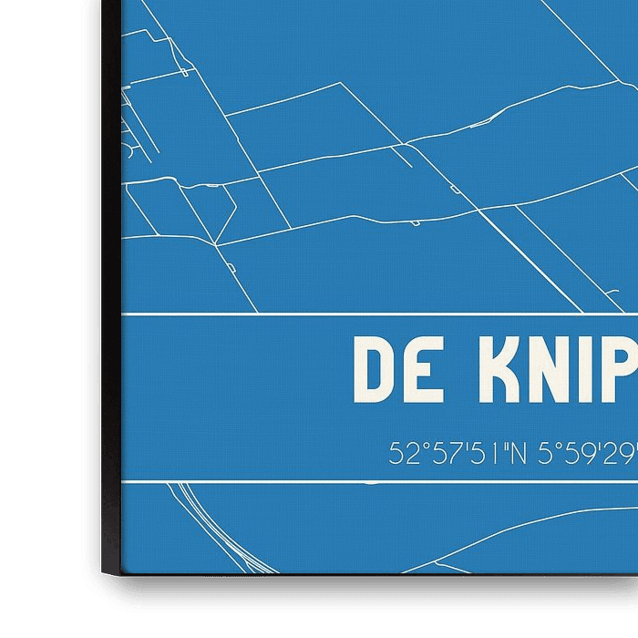 Blauwdruk van de landkaart / plattegrond van de Nederlandse plaats De Knipe, gelegen in gemeente Heerenveen, provincie Fryslan. De kaart bevat alle openbare wegen en de coördinaten van het centrum van De Knipe.