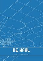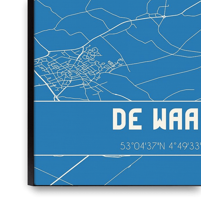 Blauwdruk van de landkaart / plattegrond van de Nederlandse plaats De Waal, gelegen op de Wadden, in gemeente Texel, provincie Noord-Holland. De kaart bevat alle openbare wegen en de coördinaten van het centrum van De Waal.