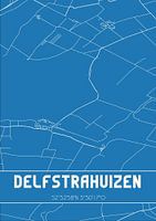 Blauwdruk van de landkaart / plattegrond van de Nederlandse plaats Delfstrahuizen, gelegen in gemeente De Fryske Marren, provincie Fryslan. De kaart bevat alle openbare wegen en de coördinaten van het centrum van Delfstrahuizen.