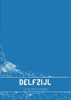 Blauwdruk van de landkaart / plattegrond van de Nederlandse plaats Delfzijl, gelegen in gemeente Delfzijl, provincie Groningen. De kaart bevat alle openbare wegen en de coördinaten van het centrum van Delfzijl.