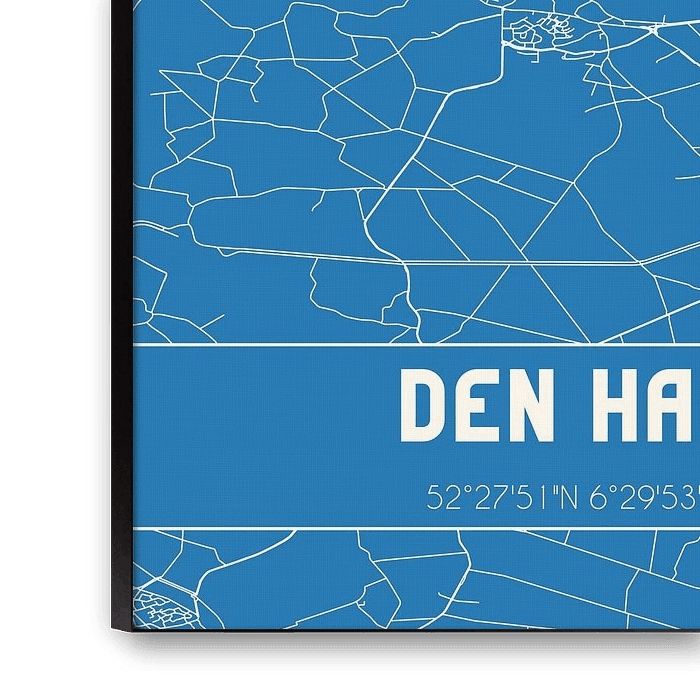 Blauwdruk van de landkaart / plattegrond van de Nederlandse plaats Den Ham, gelegen in Twente, in gemeente Twenterand, provincie Overijssel. De kaart bevat alle openbare wegen en de coördinaten van het centrum van Den Ham.