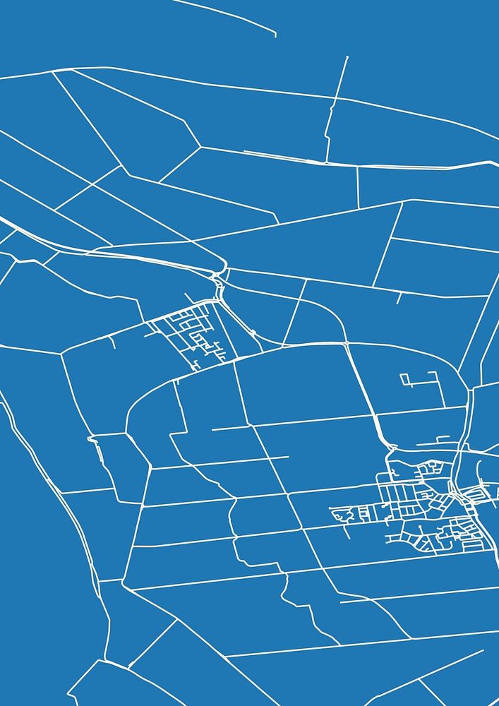 Blauwdruk van de landkaart / plattegrond van de Nederlandse plaats Dirksland, gelegen in gemeente Goeree-Overflakkee, provincie Zuid-Holland. De kaart bevat alle openbare wegen en de coördinaten van het centrum van Dirksland.