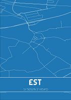 Blauwdruk van de landkaart / plattegrond van de Nederlandse plaats Est, gelegen in de Betuwe, in gemeente West Betuwe, provincie Gelderland. De kaart bevat alle openbare wegen en de coördinaten van het centrum van Est.