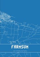 Blauwdruk van de landkaart / plattegrond van de Nederlandse plaats Farmsum, gelegen in gemeente Delfzijl, provincie Groningen. De kaart bevat alle openbare wegen en de coördinaten van het centrum van Farmsum.