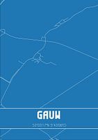 Blauwdruk van de landkaart / plattegrond van de Nederlandse plaats Gauw, gelegen in gemeente Sudwest-Fryslan, provincie Fryslan. De kaart bevat alle openbare wegen en de coördinaten van het centrum van Gauw.